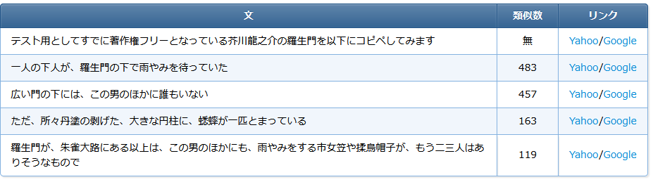入力された文章を、以下のように適度な文に区切り、その文が使われているwebページ数の目安を類似数として表示します。